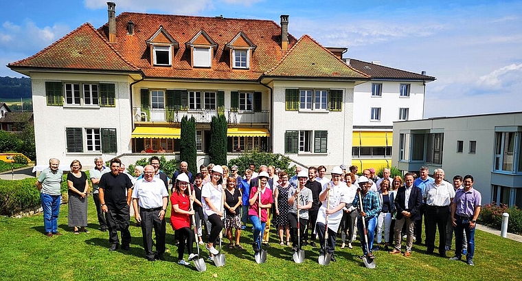 Beinwil am See Mit einem gross inszenierten Spatenstich wurde diese Woche der Startschuss zum Ersatzneubau der Stiftung Dankensberg gegeben. Ausgeführt wurde die symbolische Handlung von sechs Lernenden des Alters- und Pflegeheims. «Die Jugend baut für die Zukunft», kommentierte Stiftungsratspräsident Hans Schärer diese Disposition. Ansonsten freute sich Schärer darüber, dass es endlich losgeht mit dem 14-Millionen-Franken-Projekt. Bereits zu 22 Sitzungen hat sich die Baukommission getroffen, wie Präsident Thomas Gubler ausführte. Der vom Zürcher Büro Fiechter & Salzmann Architekten geplante Neubau ersetzt zwei bisherige Gebäude, darunter den historischen Bau im Hintergrund. Läuft alles optimal, soll der neue «Dankensberg» im Frühjahr 2021 bezugsbereit sein. (tf) Foto: Fritz Thut